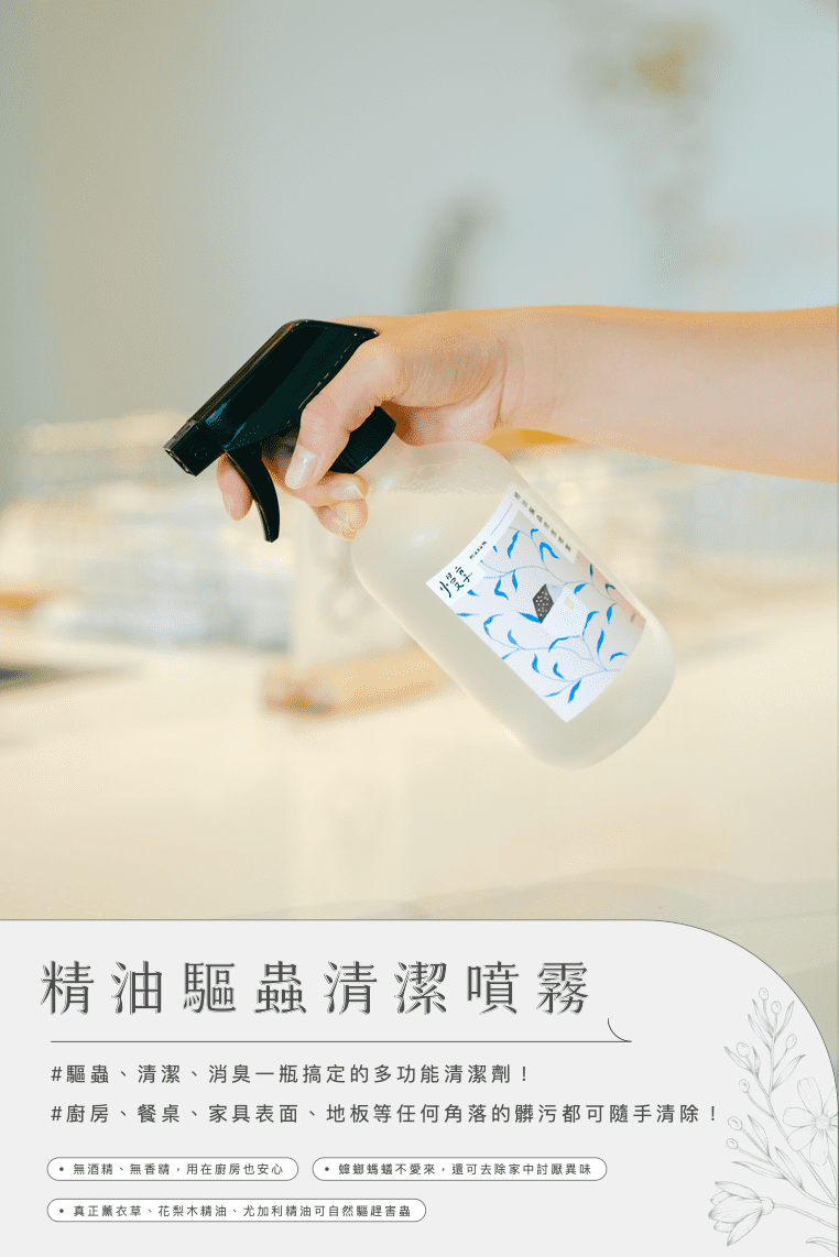如果需要大面積使用於地面,建議搭配需要稀釋、適合大面積拖地的精油驅蟲地板清潔購買,為全家打造更省力、更健康的乾淨環境唷!